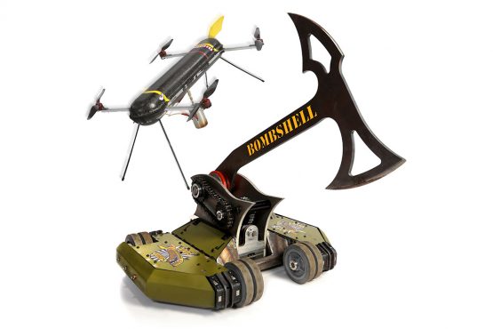 Robot: Bombshell Type: Modular (axe, horizontal bar, lifter, vertical disc) Team: Chaos Corps Michael Jeffries (Captain/Driver of main bot), Julie Simancek (Wife/Designer/Costume), Chris Williamson (BB Veteran/Fabricator), Randy Farmer (Fabricator), Brandon Davis (Lifter), Jamie Price (BB Veteran/R2D2 well known/Design and Fabrication), Dan Hammer (CAD/Fabricator), Matthew Carroll (CAD/Fabricator), Jason Brown (Heading up the drone bot), Simon Arthur…