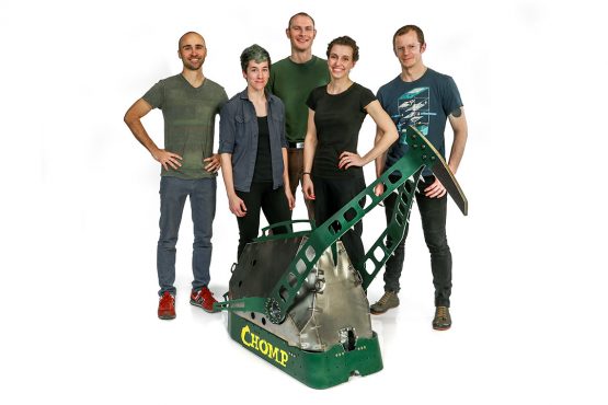 Robot: Chomp Type: Pneumatic Hammer with Flamethrower Team: The Machine Corps Zoe Stephenson, Jascha Little, Jo Balme, Aaron Cooper, Dimitar Vassilev Hometown: Glendale, CA Sponsors: Applied Invention, LeddarTech, Ix Machines, Thunder Power RC Website: facebook.com/ChompTheBattleBot twitter.com/AlwaysBChomping Builder: Zoe Stephenson Job: Mechanical Engineer Years competing: 1 year Favorite tool: Waterjet Favorite robot: Opportunity, the Mars Rover…