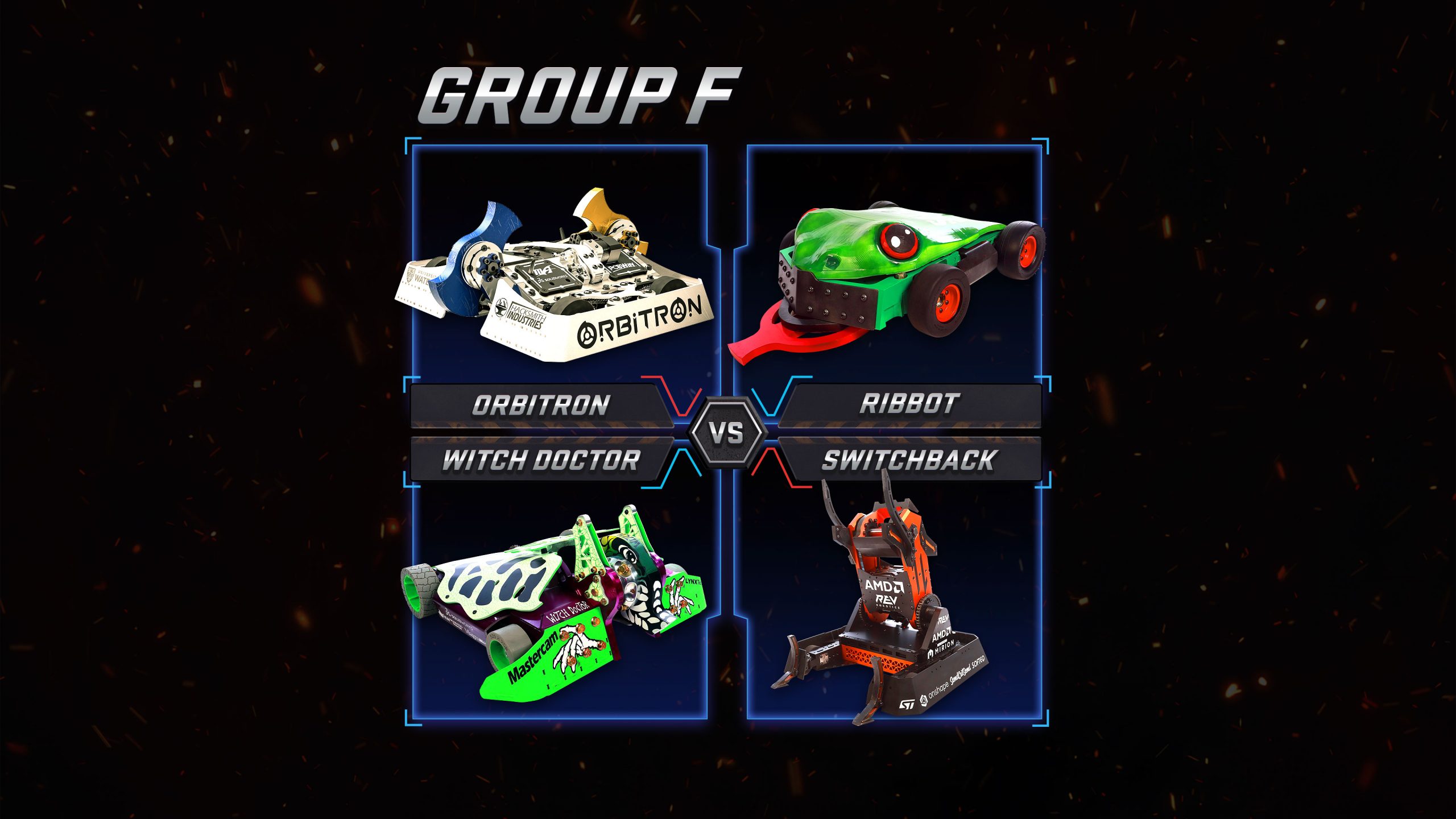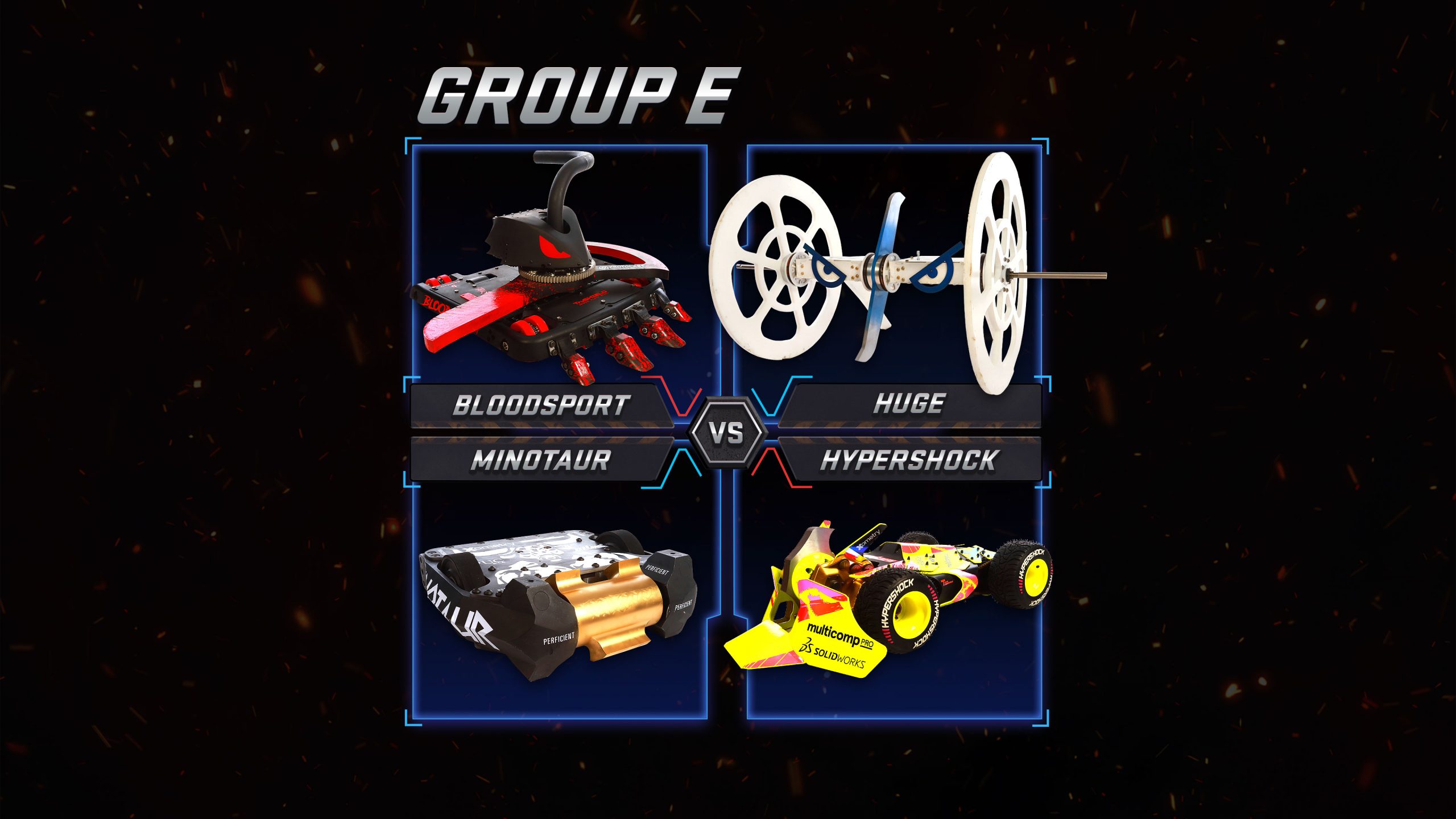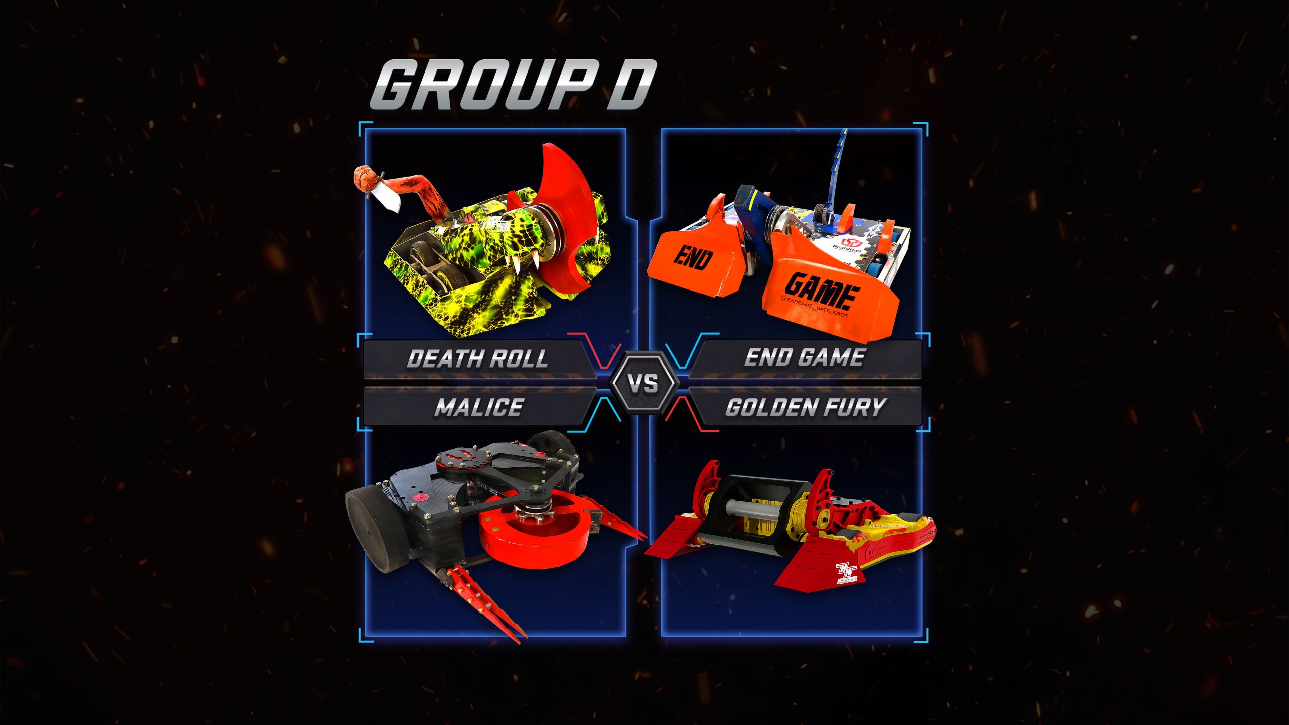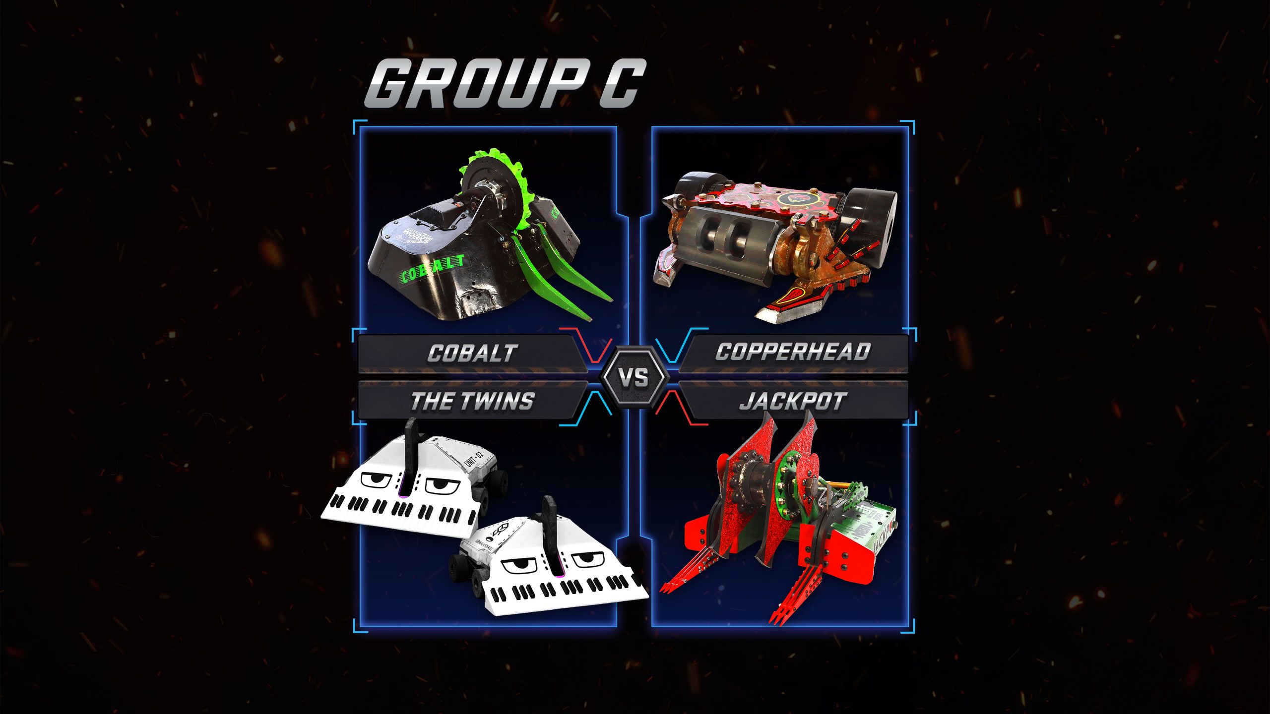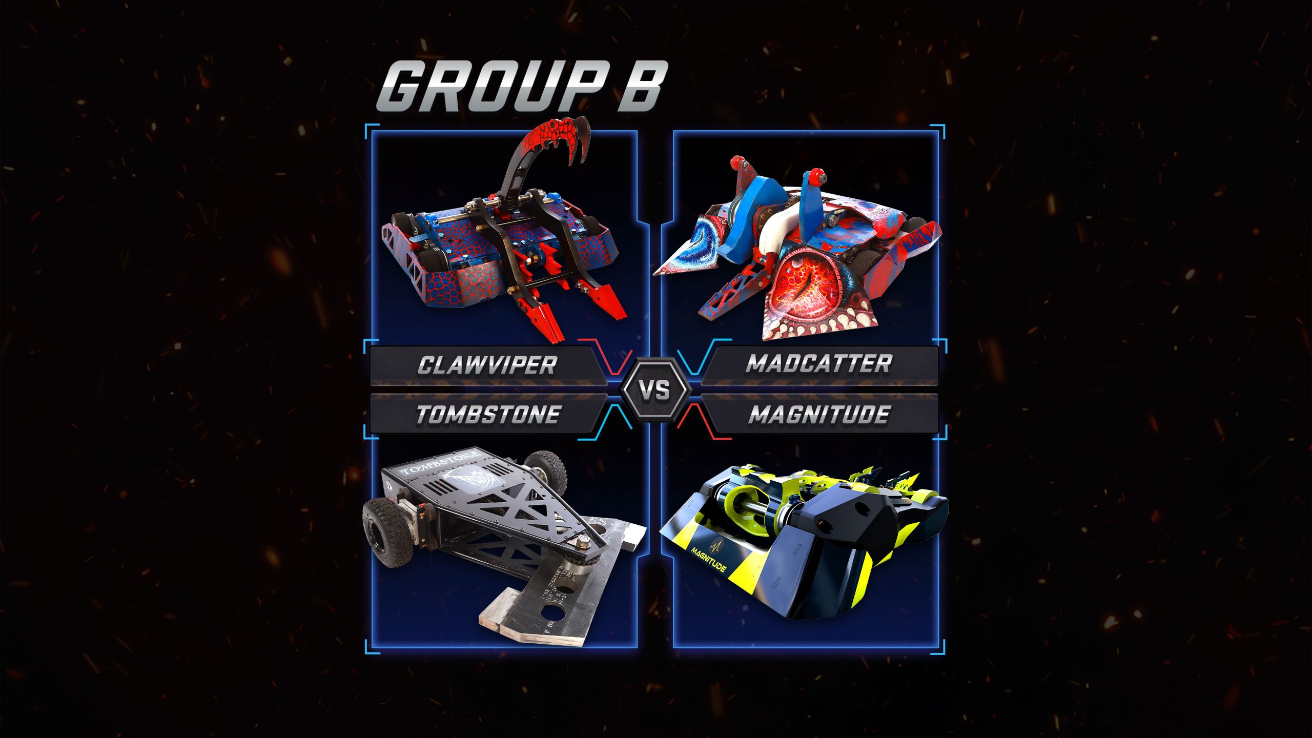 All 24 teams take part in an intense Group Stage, where every win or loss propels the team up or down the league. The Group winners go through to a knockout winner-takes-all competition, culminating in a final fight to the death to establish the first BattleBots Pro League Champion.